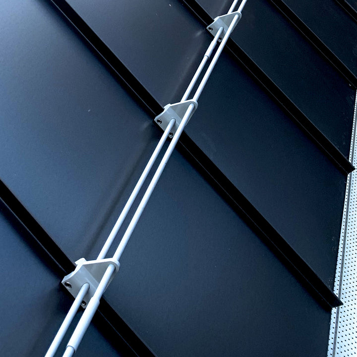 ASG4025-Mini Pipe-Style Snow Guard is a non-penetrating, clamp-to-seam system ideal for metal standing seam roofs with ≤4/12 pitch, rafter lengths ≤10', and ground snow loads ≤40 psf. Forged from a solid block of recycled aluminum, its robust 1 1/2-inch thick construction and centered flag position offer enhanced durability and balanced aesthetics. This smaller version of the ASG4025 uses 3/8-inch OD rods and preserves roof panel warranties.