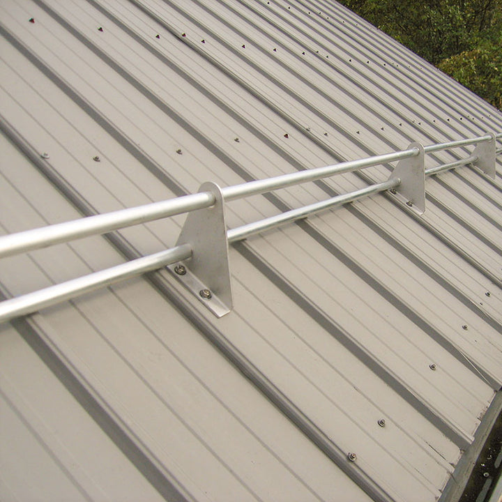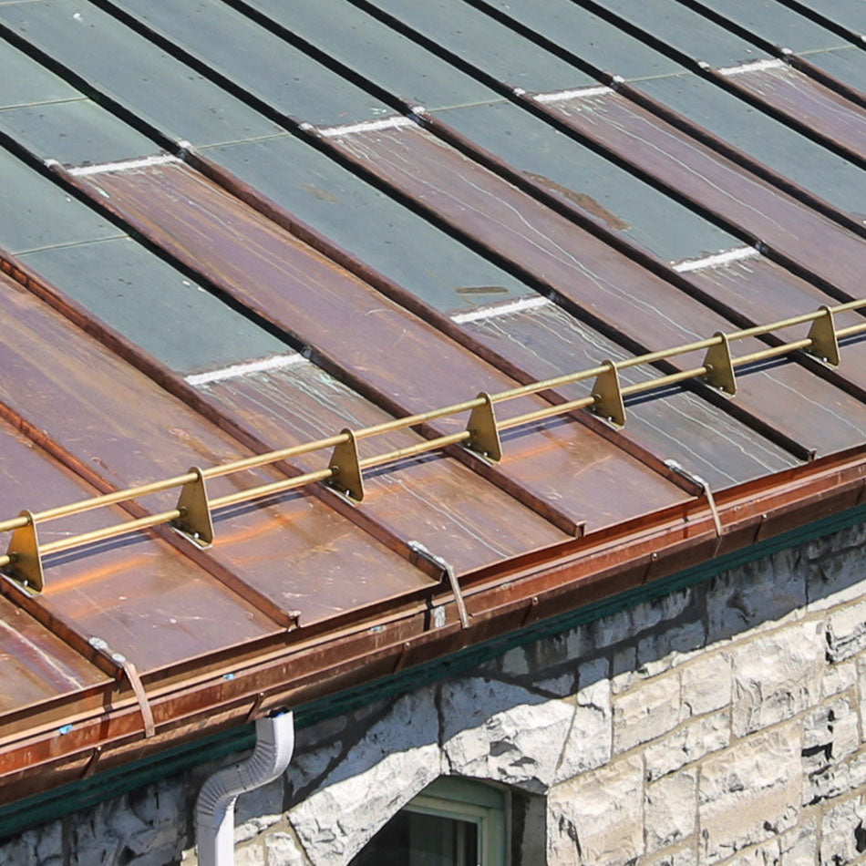 The PP315 Pipe-Style Snow Guard is a direct-to-deck system featuring a narrow baseplate, enabling installation on battens with a flashing. This specialized guard is available in Aluminum, Brass, or Stainless Steel brackets with a Stainless Steel or Brass base plate measuring 6”(L) x 2”(W). It accepts 1” OD pipe (tubing) in multiple configurations (2-Pipe, 3-Pipe, 2 Hi-Pipe) and is compatible with optional accessories like Ice Flags and Ice Screens.